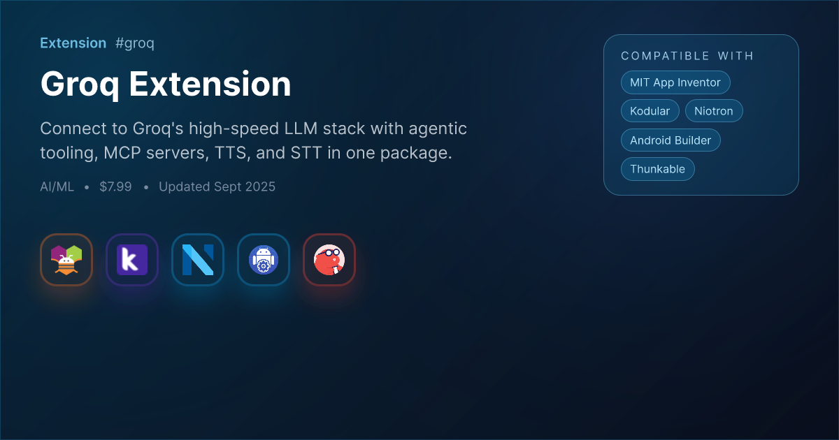 An extension for MIT App Inventor 2.Extension to integrate AI Text and Vision Models in applications using Groq API with streaming support. My other extensions