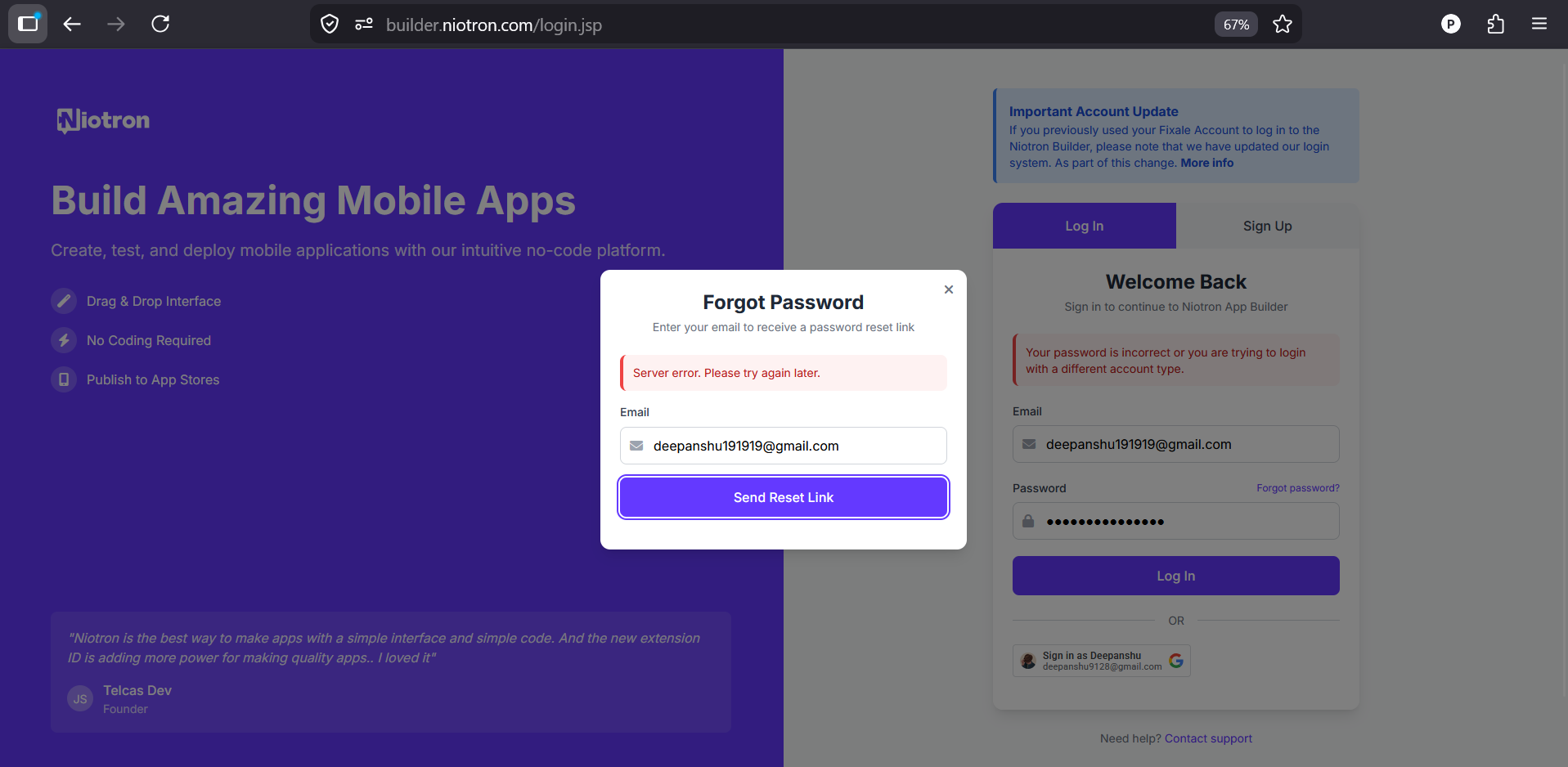 When tried to login with the same credentials its show incorrect, same with forgot password its show same server error.