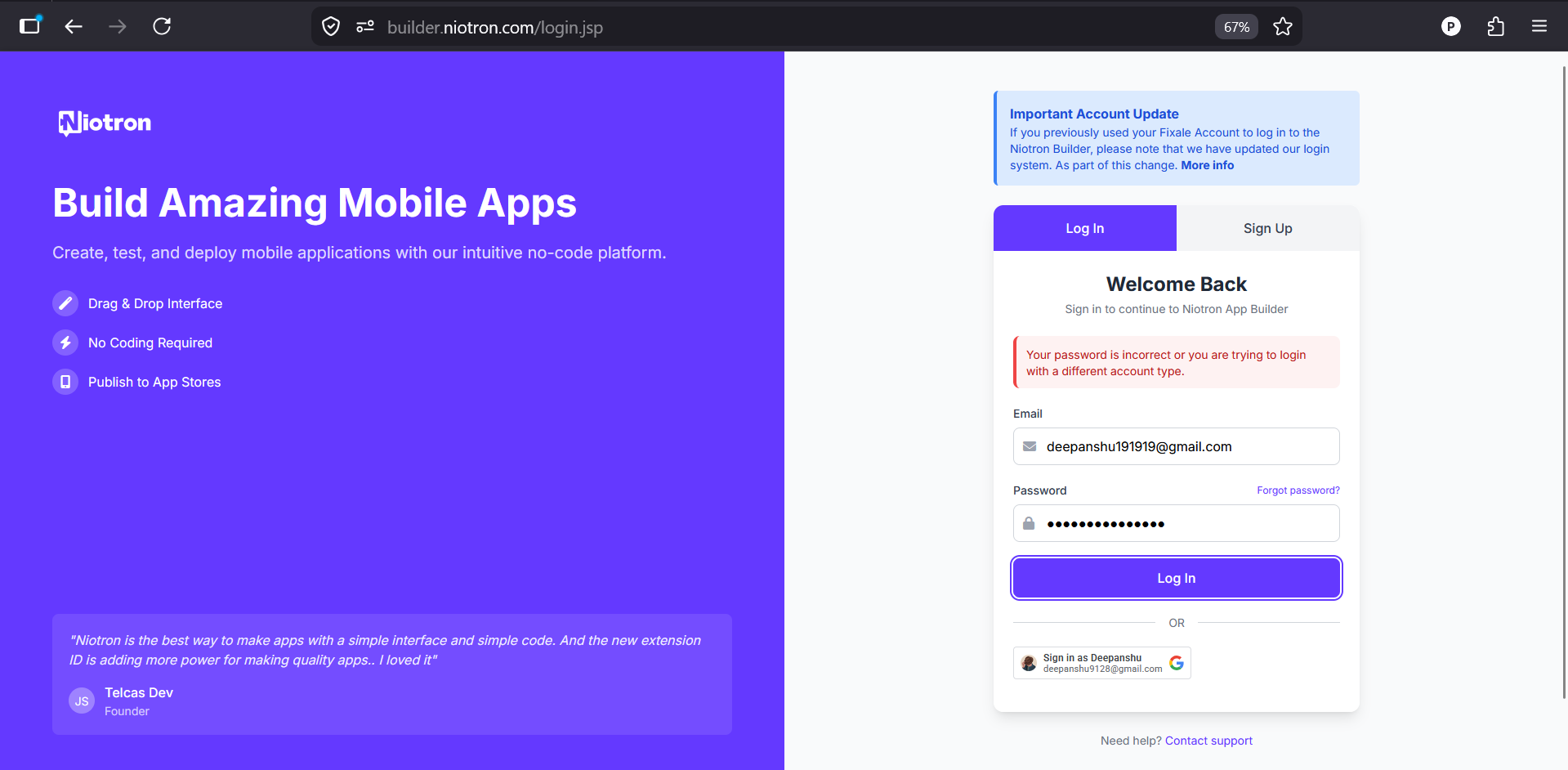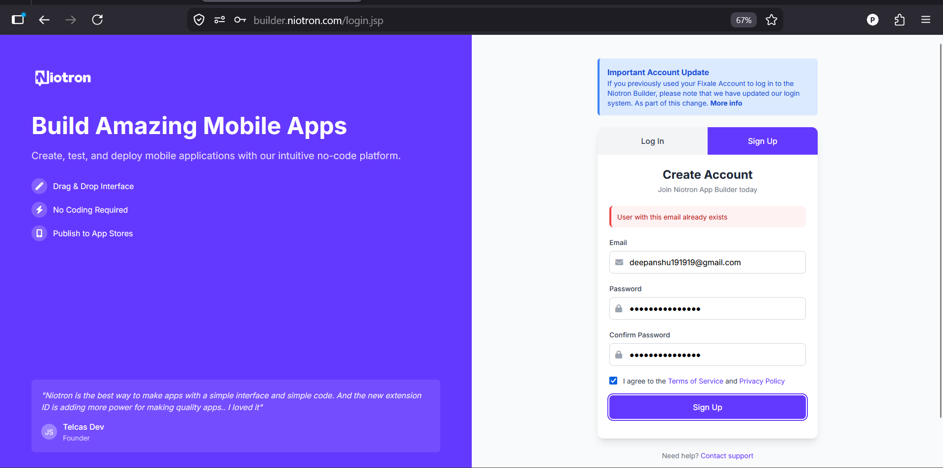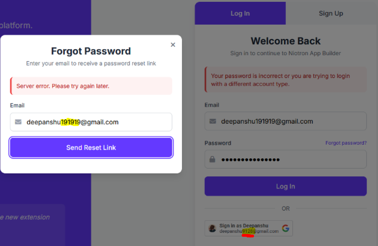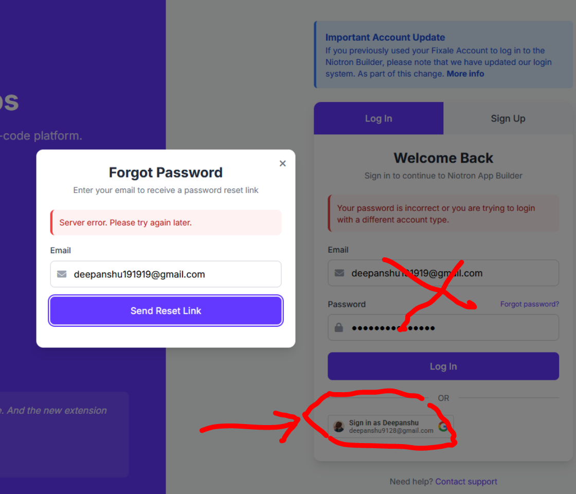 @niotron @NiotronStaff Is there any issue with the login and signup? When I was creating a new account for my project instead of login through google sign on I used manually when I clicked on signup button it’s show server error, again I pressed the signup button it’s showed the email address is already used.